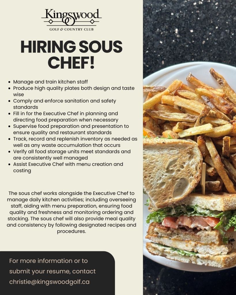 Employment Opportunities We are hiring! Position vacancy for a Sous Chef. For more information or to submit your resume, contact christie@kingswoodgolf.ca